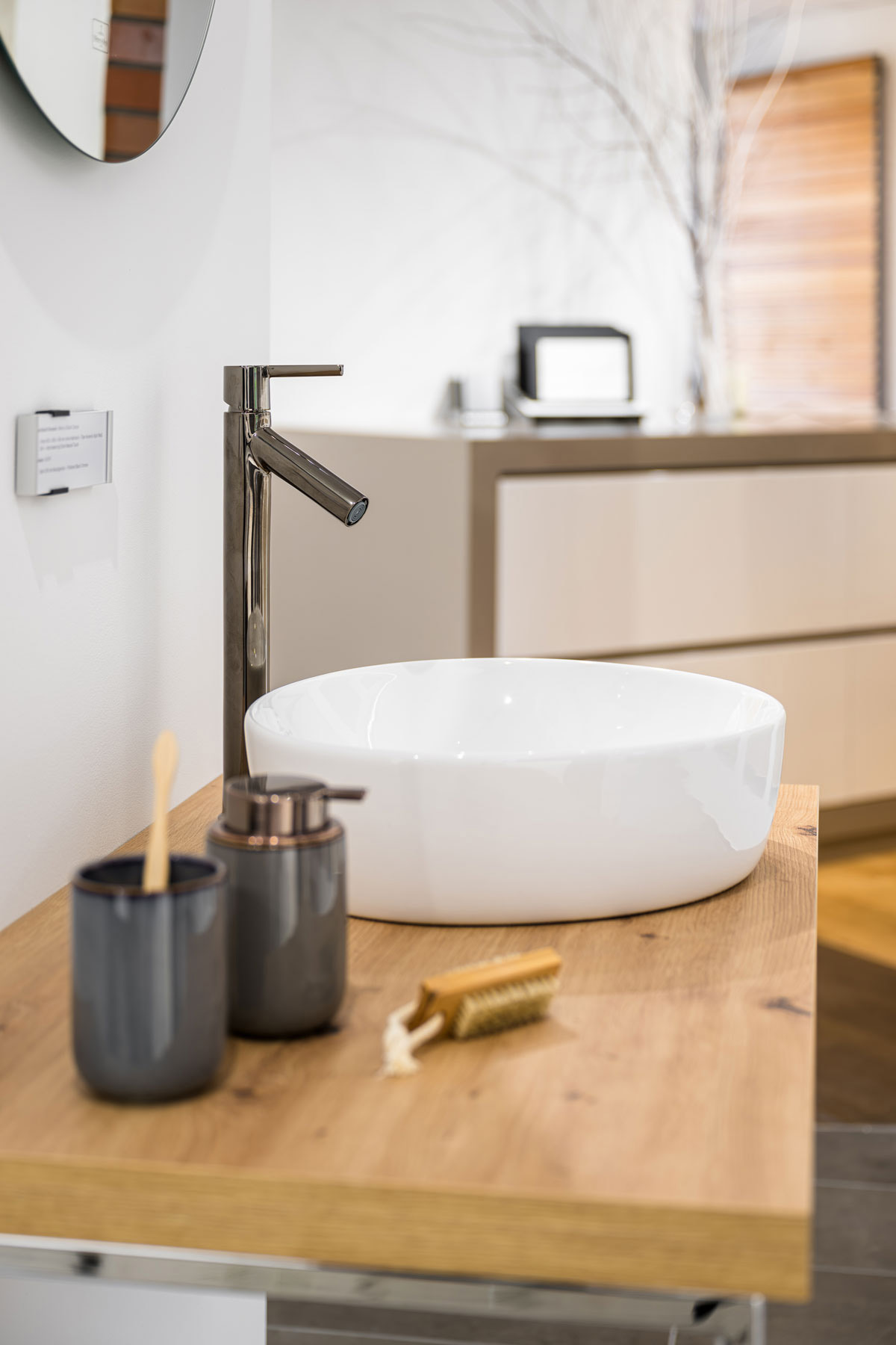 In unserem Showroom im Herzen von Lüneburg können Sie die Ausstattungsdetails anfassen und neben den Farben auch zwischen runden und eckigen Armaturen wählen.